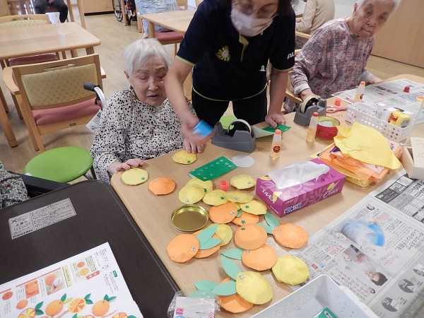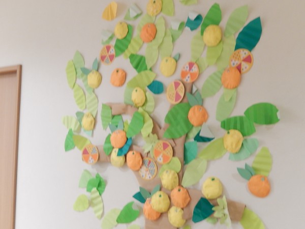 出来上がった“みかん達”をこれまた事前に作っておいた木に“ワイワイ”と、たくさん貼り付けて~(^_^)