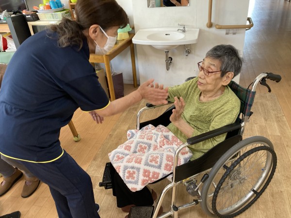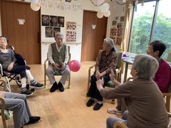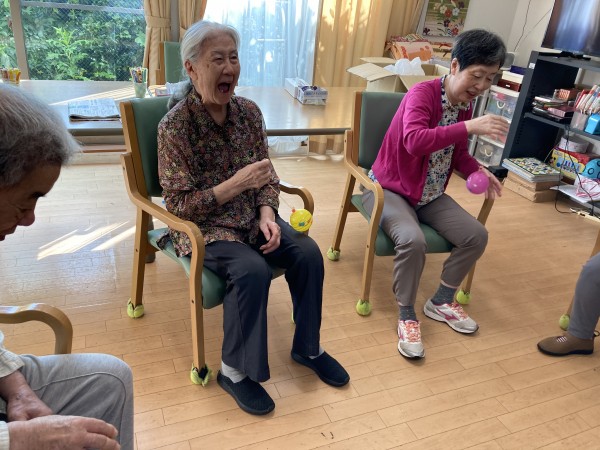 先日、フロアで輪になって皆様と一緒に「昔遊びレク」を行いました!