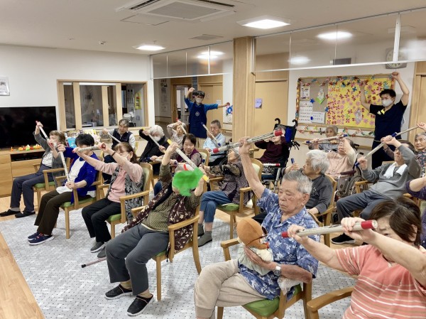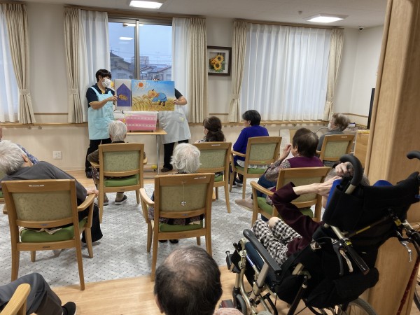 肩たたきの歌に合わせ棒体操〜タントン タントン タントントン〜♪ 紙芝居では「なんにもせんにん」を真剣な表情で聞いて下さりありがとうございました! 秋にちなんだ歌も大きな声で元気に歌いましたね〜♪和やかで一体感があり皆さんの歌声には雷もかないませんね!