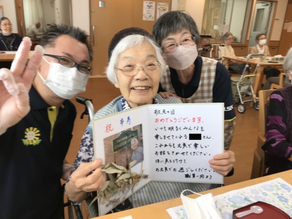 敬老会では長寿の祝いで六名の方が対象でしたのでご入居者様代表でお祝いさせて頂きました。