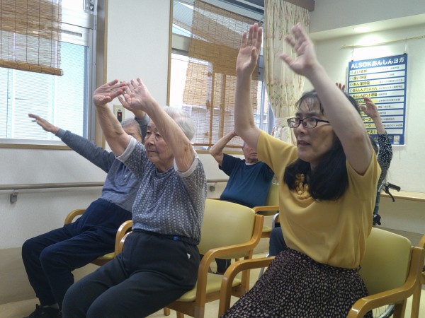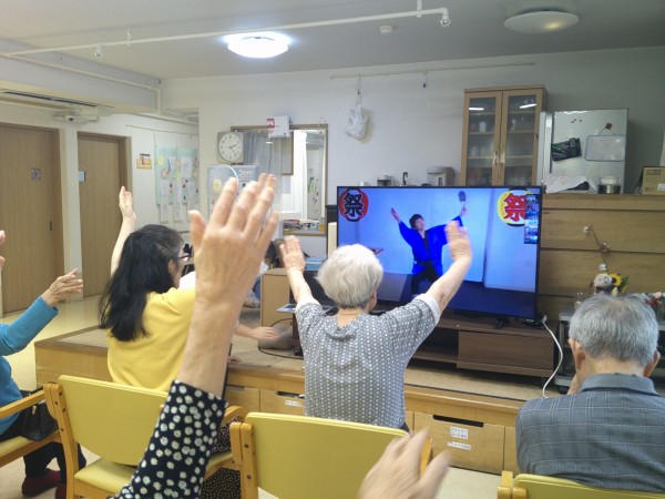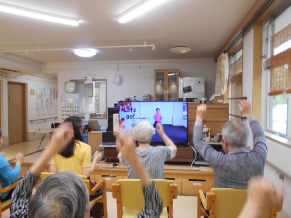 皆さんテレビ画面に集中して一生懸命に体操されています
