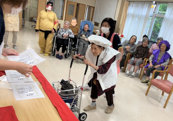 ホーム長からの挨拶はサクッと終わり、獅子舞のような珍妙な動きで登場するスタッフ♪