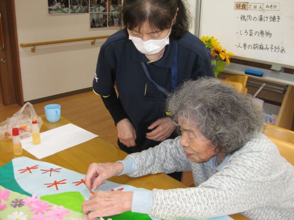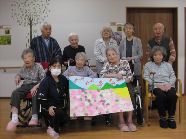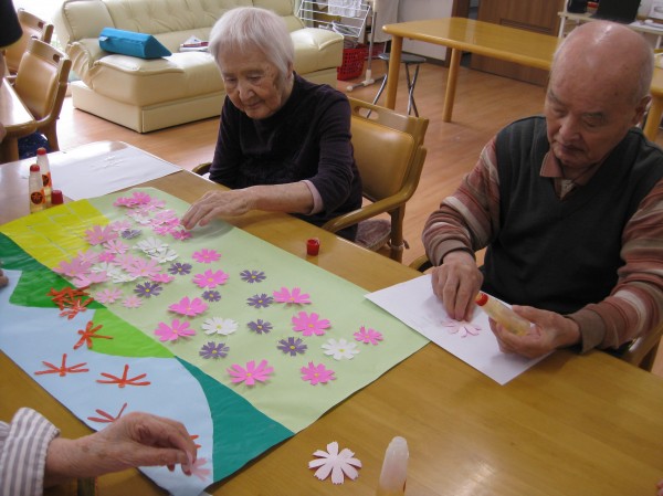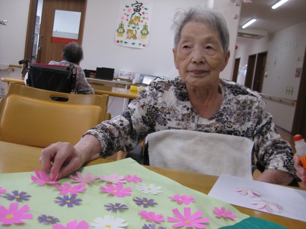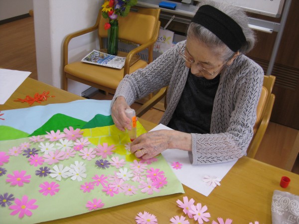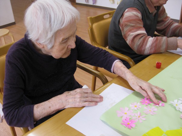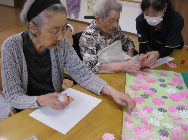 こんにちは! グループホームみんなの家・あきがせの介護ブログです! よろしくお願いいたします。 今日はコスモスの貼り絵をしているご様子をお知らせいたします!!
