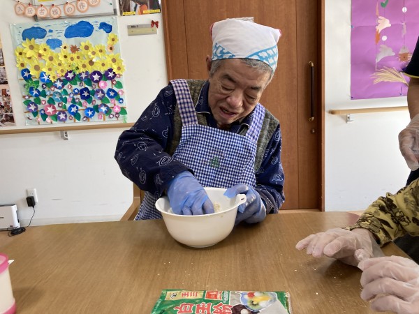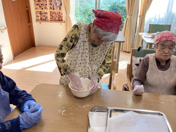 今回は皆様とおやつレクにて「豆腐入りお月見団子」を作りましたので、