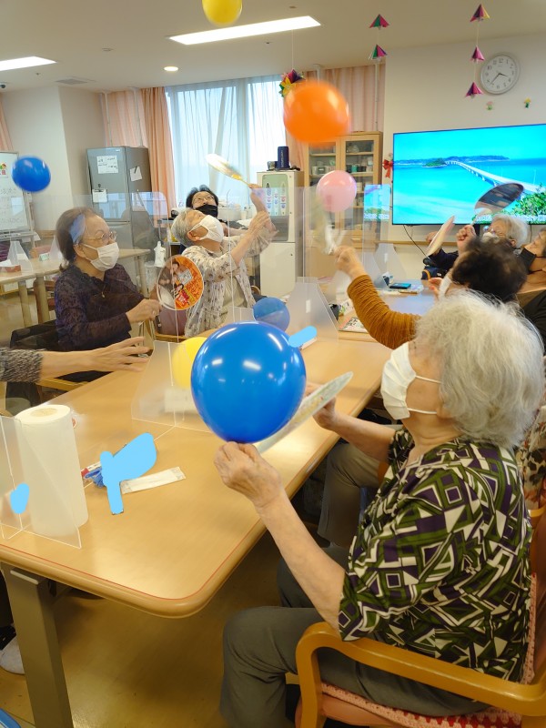 皆様にうちわを持っていただき、風船を叩いて相手陣地に落とした数が多いチームの勝ちです!
