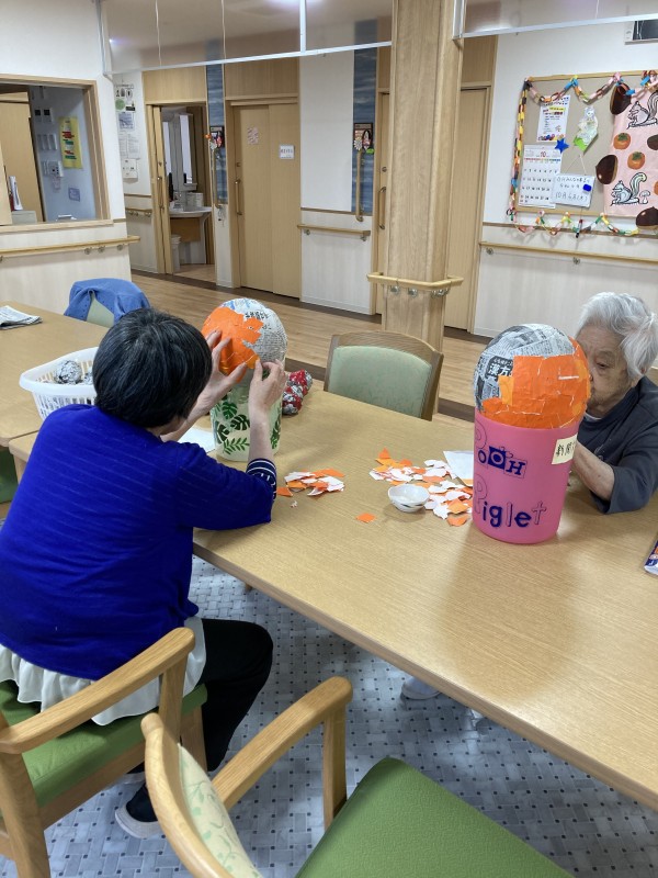 カボチャのお化け「ジャックオランタン」作りは順調にすすんでいます。毎日少しずつ皆さんで貼り絵をしていき、いよいよ顔が完成です♪