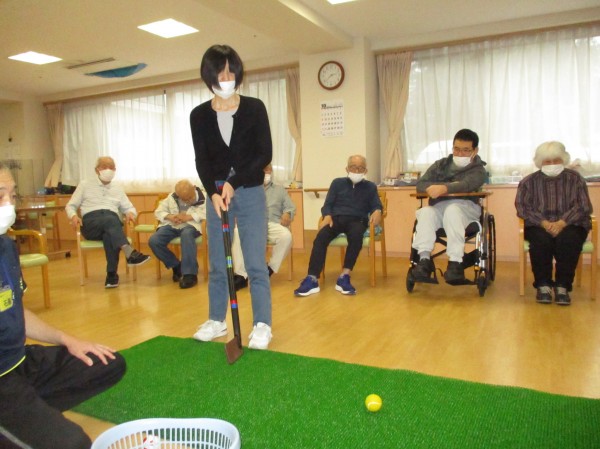 皆さん、パターゴルフに慣れられ女性の高得点が散見されます。1人5回パターを振ってゴルフボールをホールインワンの