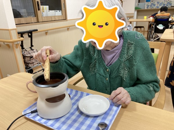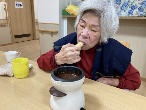 「甘い!美味し~い」と入居者様からは大好評!余ったチョコレートはミルクチョコレートにしてお出しした所、こちらも大変喜んでくださいました。