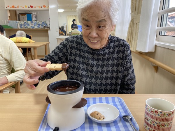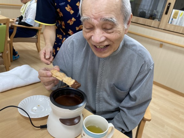 今日のおやつレクはチョコレートフォンデュです。とろとろに溶けたチョコレートをパイで掬って召し上がって頂きました。