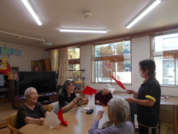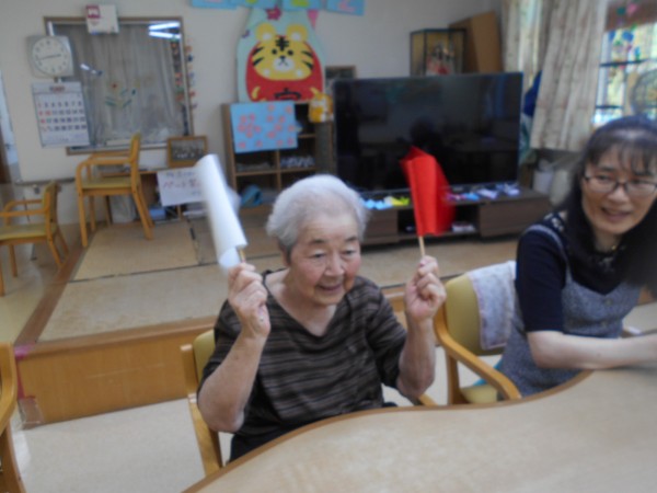 午後のレクリエーションは皆さんの大好きな紅白旗揚げ体操です
