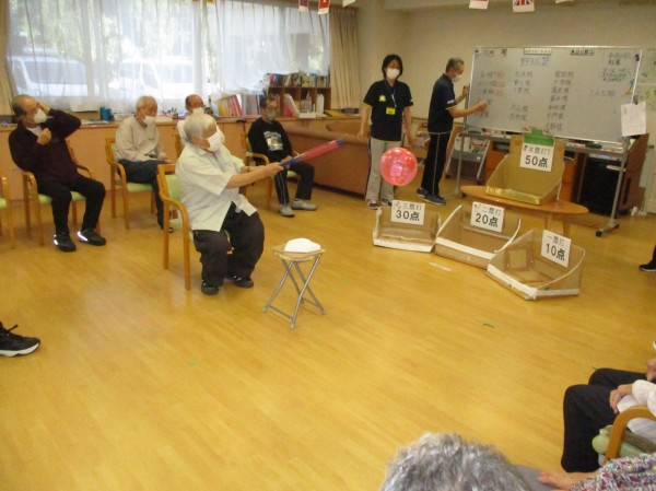 今日の運動レクレーションは『野球盤』です。1人5回振った得点の合計値で勝負です。皆様、日頃のストレス発散なのか
