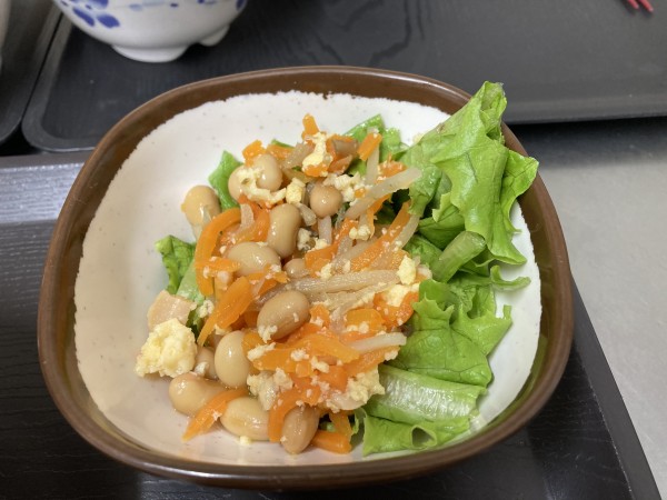 本日は、ぜんまいともやしのナムルにほうれん草を追加し、野菜の卵あえにリーフレタスを添えました。