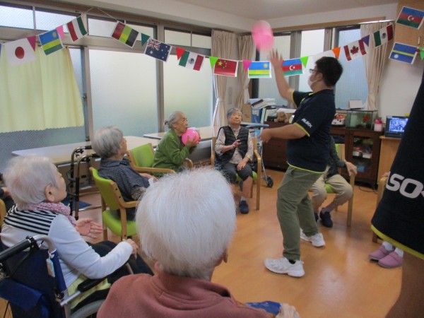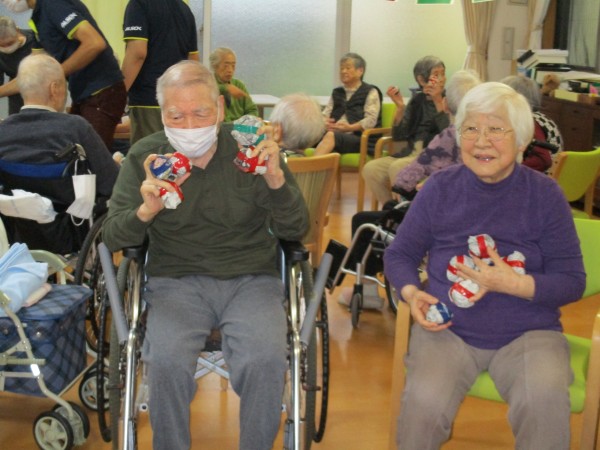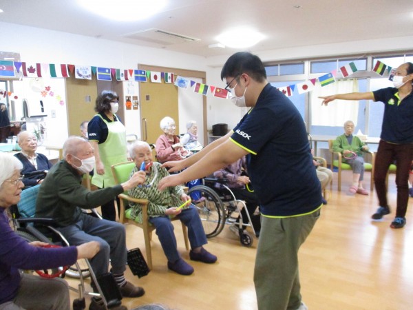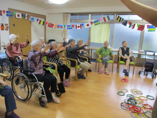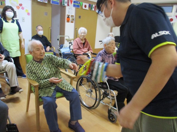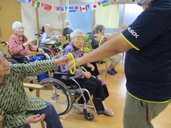 輪投げは入居者様がスタッフの腕に投げて何本受けられたか競います!