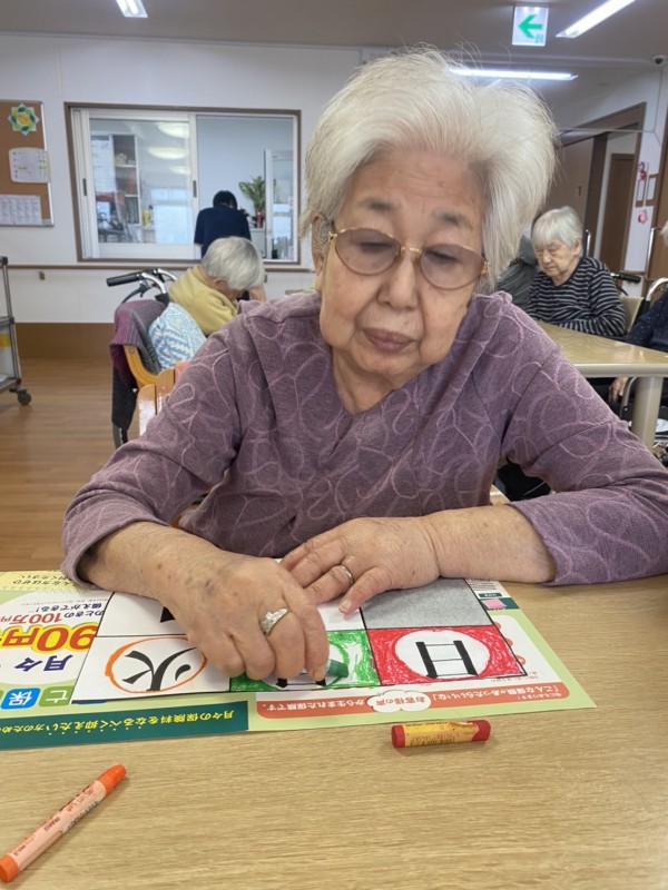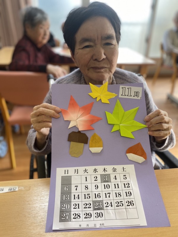 手指のリハビリの他に、秋の季節を表現する事で今を意識し季節感を味わう。