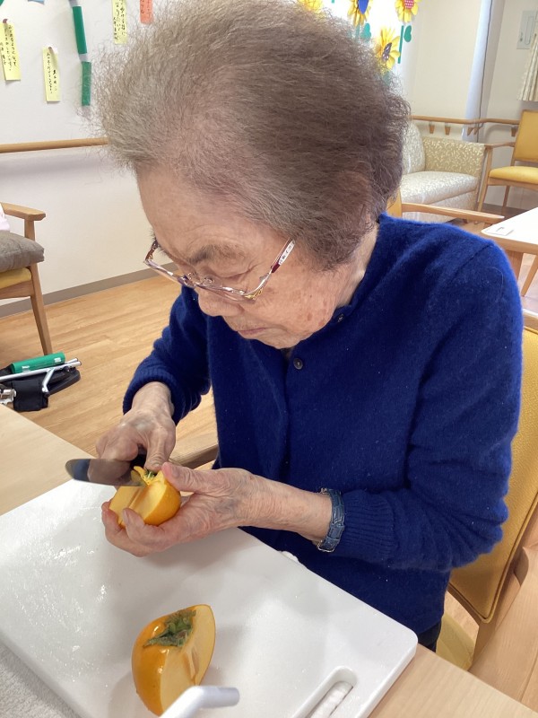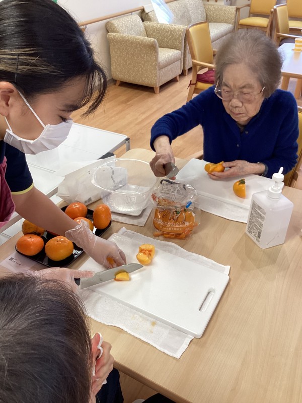 スタッフが柿を買ってきてくれたので、おやつレクを行いました\( ˆoˆ )/