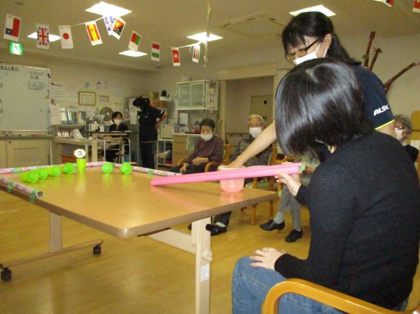 いつのまにか楽しんでおられました。又、負けず嫌いの方が多く賑やかな運動レクレーションとなりました。!(^^)!