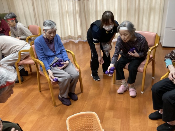 職員と利用者さんと新聞紙で作った輪っかを職員の手・足に利用者様が投げ入れます。