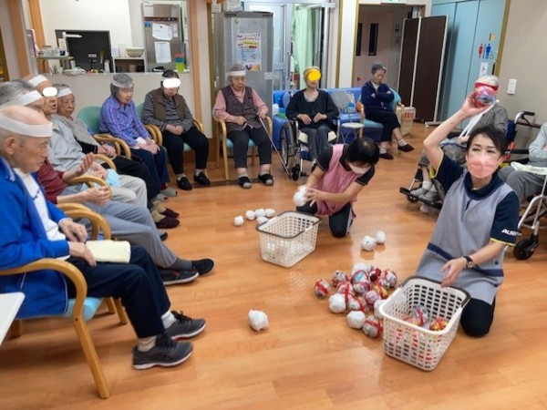 皆さんで玉や輪っか、風船を膨らまして準備したもので、力いっぱい楽しみました。