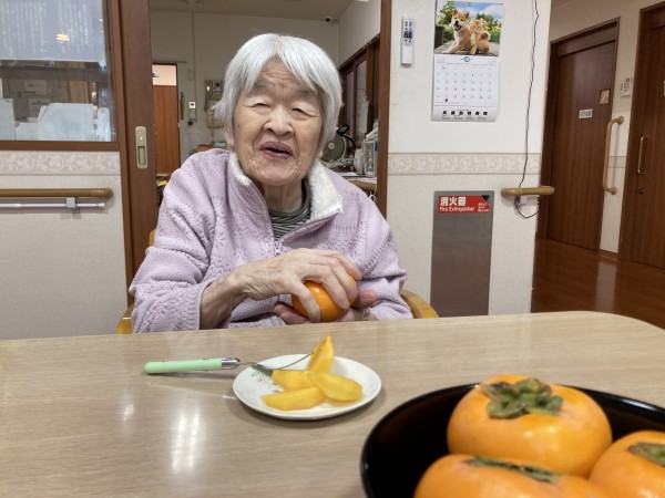 「うわぁ!甘そう」「昔干し柿作ったのよ!畑の周りにシブ植えてたから。途中で食べたくなっちゃうのよね…」