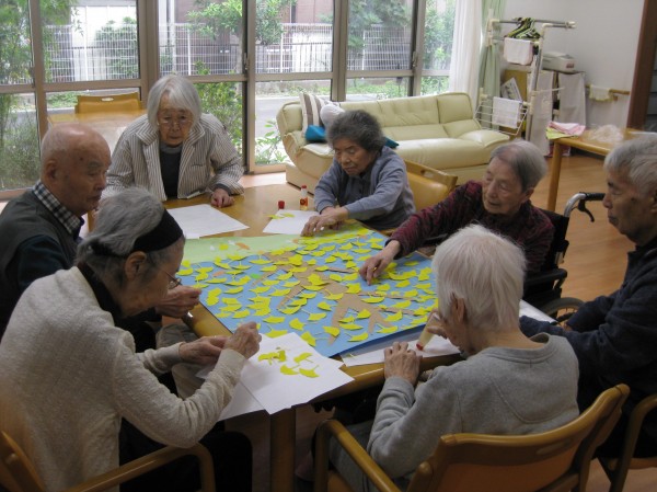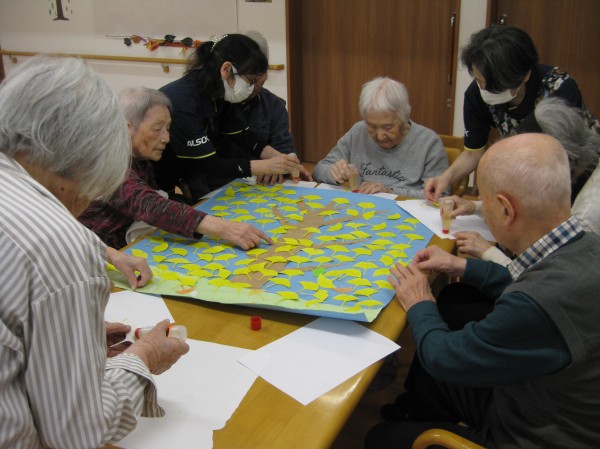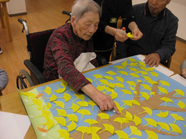すっかり季節も秋になり、今月の貼り絵はいちょうです!!