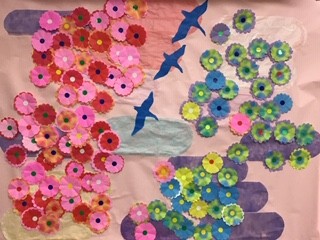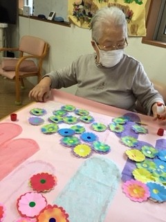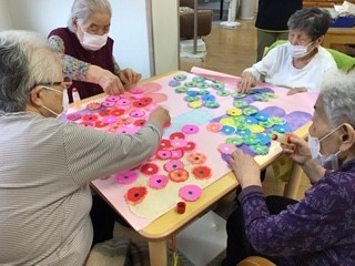 折り紙を小さくたたんで、お花作りの始まりです♪