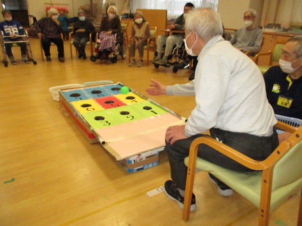 今回の運動レクレーションは『コロコロビンゴ』です!大きな箱の中を区分して穴があいています。穴には数字が書いてあります。