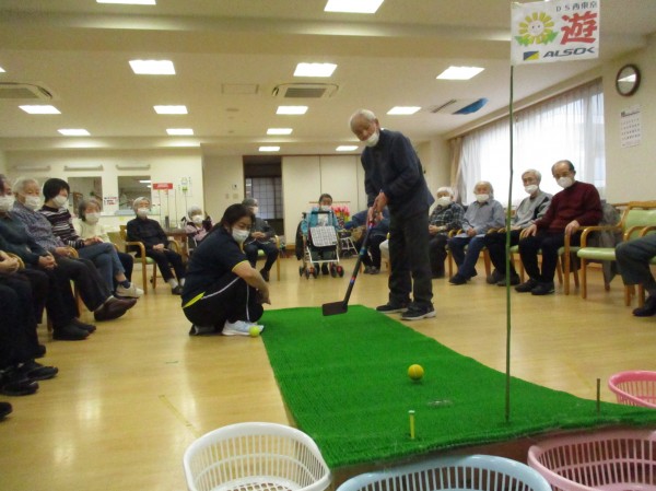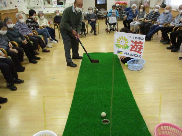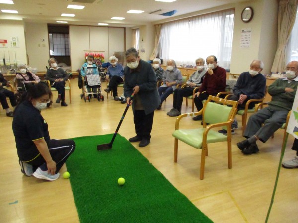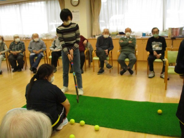 今日の運動レクレーションは『パターゴルフ』です!色々な種類のボール10個を使ってホールインさせるゲームです!