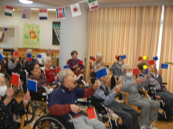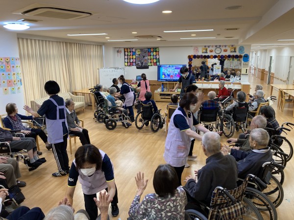ご利用者様はその場で体を動かすも、職員は輪の中を音楽が終わるまで回り続けました。
