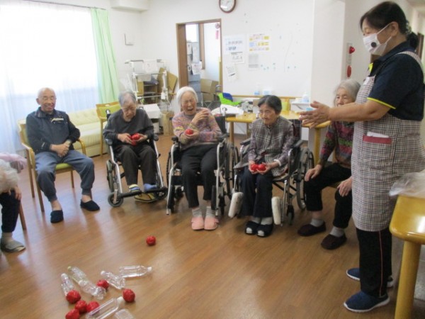 みんなで丸なって一斉にボールを投げてボーリング遊びをしました!!