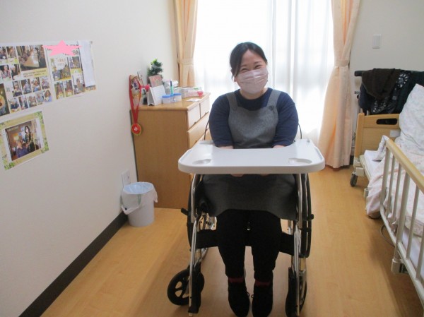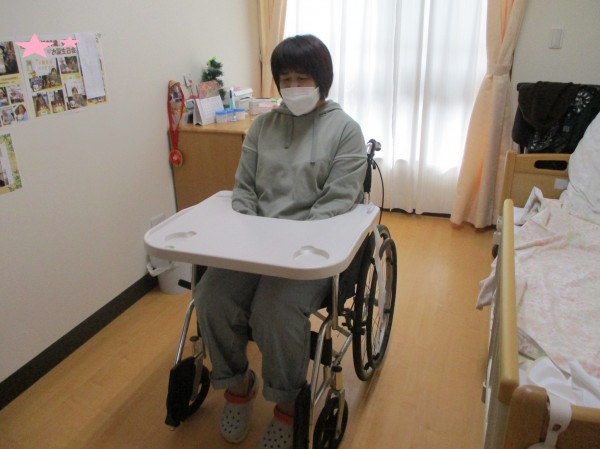 抑制の体験では車いすテーブルで動きを制限されている体験です。