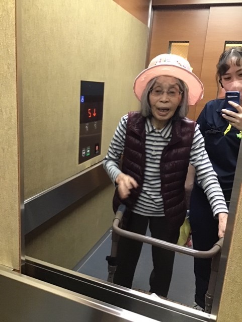 お部屋に帰る際、エレベーターの鏡をご覧になって「私、こんなの被ってたの~!」と笑っていました。