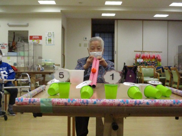 横になっている数字に記入された紙コップに筒2個を付けてできた溝から玉を転がし紙コップに入って紙コップが立ち上がったら加点されます。