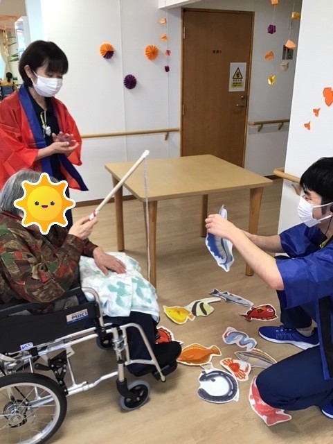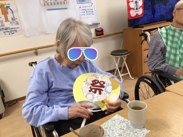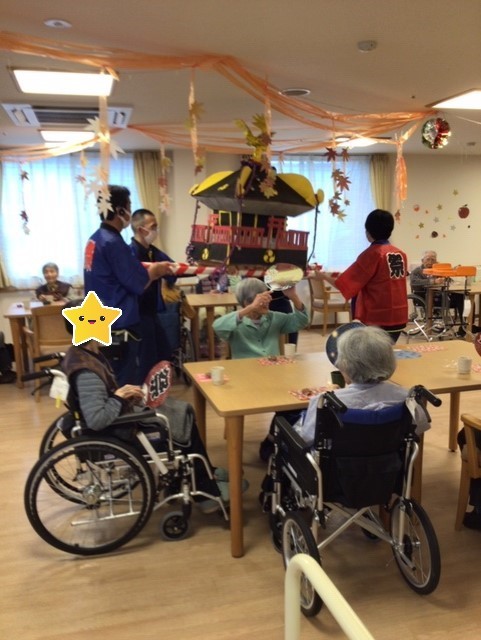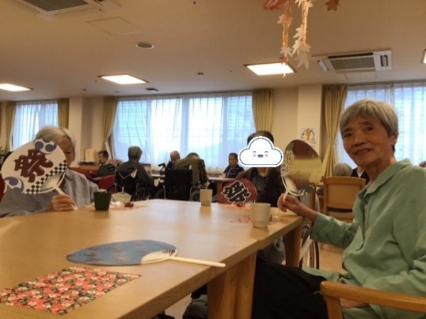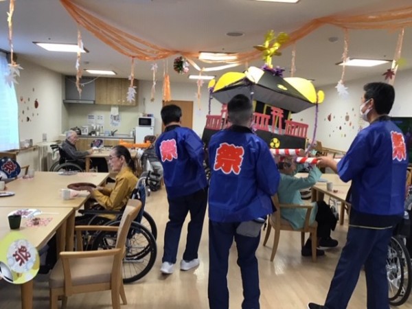 職員は法被を着てご利用者様をお迎えしました。中には、ひょっとこのお面をした職員も(笑)