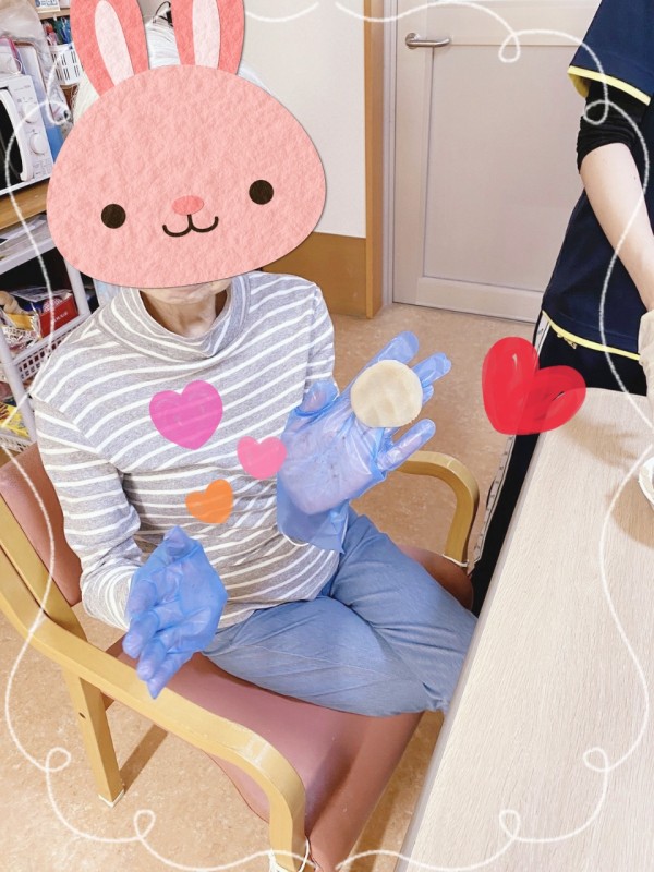 N様は丸めるというよりおいしそうと口に持っていこうとしてしまい「出来上がってから食べましょうね…」とT職員が一言(;´・ω・)