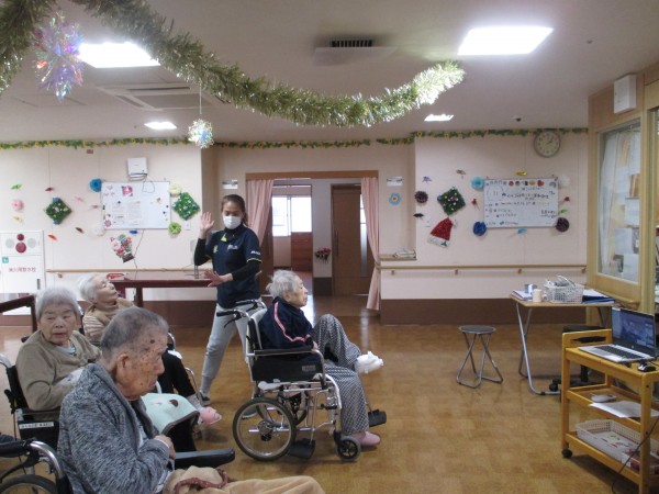 講師の岡田先生の動きを真似しながら、職員も、ご利用者様も、体操に参加されていました(^^♪。体を動かすことは、体力の低下を防ぐことにもなりますし、気持ちがいいですね(^^♪。