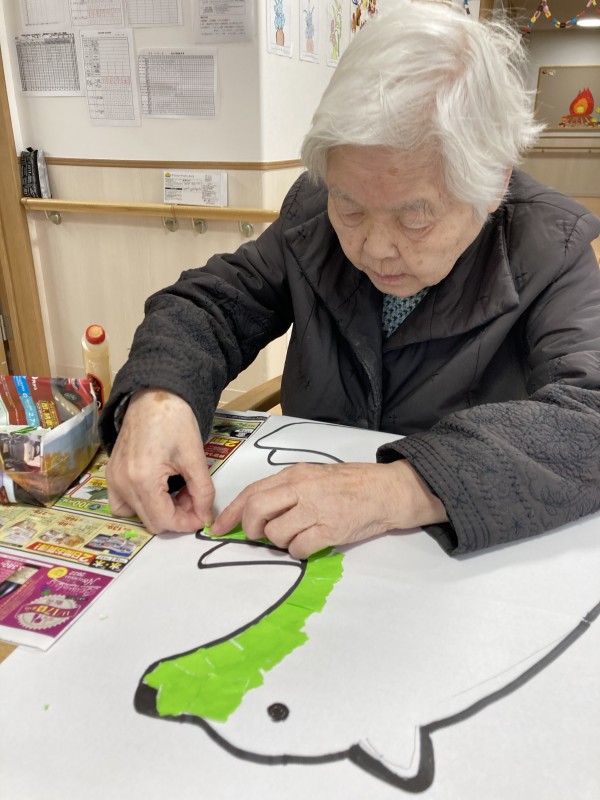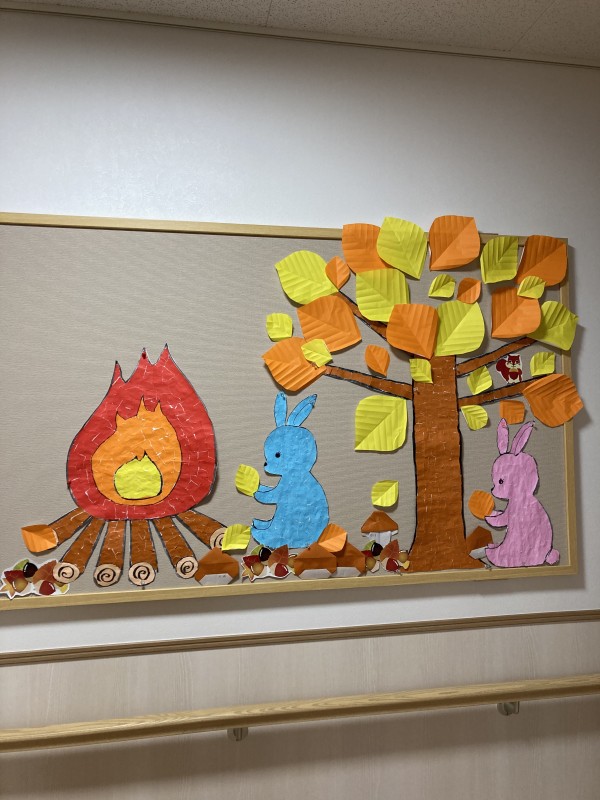 先日、壁飾りに焚き火をするうさぎさんを作りました。うさぎさんは、寂しがり屋なので、お友達を作る事にしました。真剣に綺麗な色紙をちぎり、貼り付け可愛い緑のクマさんの完成間近です。