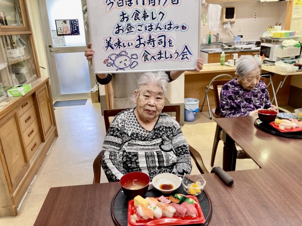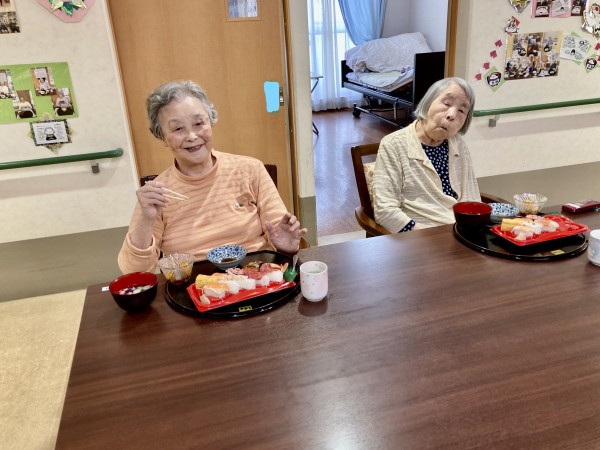 昼食では「握り寿司(デザート付)」を おやつの時間には「プリン」を