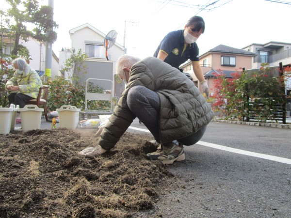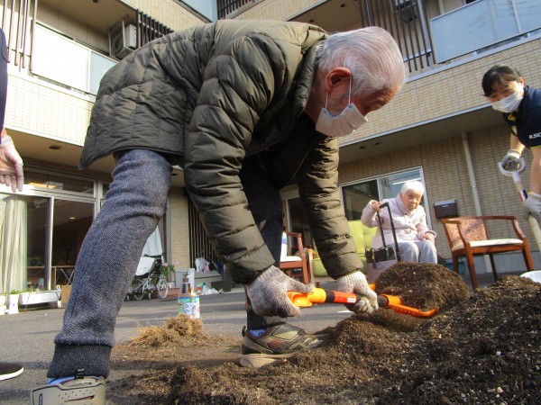 土に肥料や麦茶の粉をまぜまぜ…