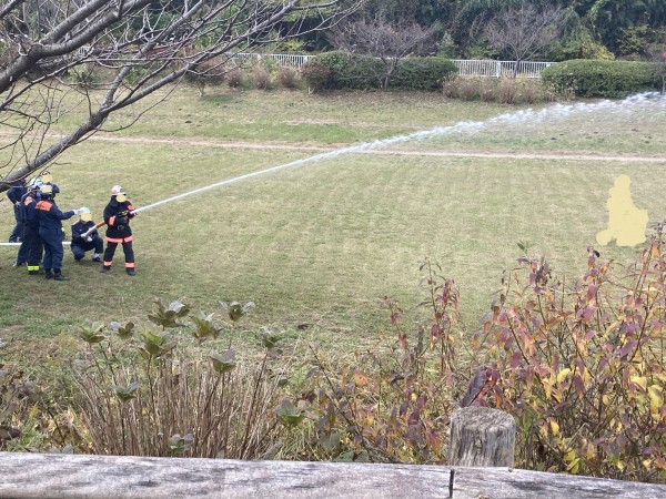 目の前の宮沢遊水地で瀬谷消防による放水訓練です。