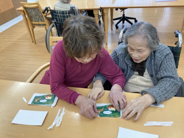 職員がサンタクロースになりプレゼントをお渡ししますがクリスマスカードの作成中です。