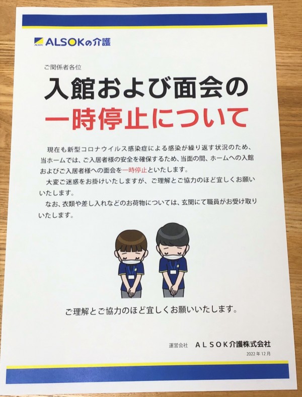 入居者様の安全を確保するため、この度ホームへの入館および入居者様への面会を一時停止とさせていただくことが決まりました。