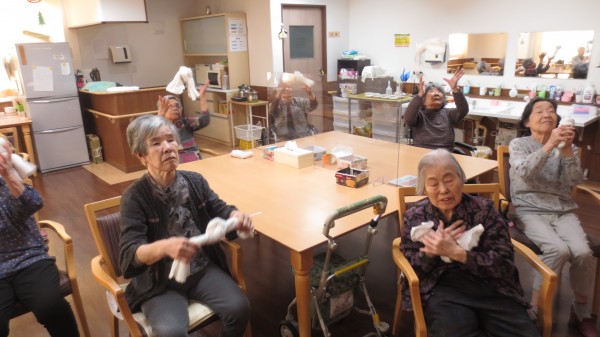 タオルを使って座って行う体操で屈伸したり体をねじったりタオルを投げたりします。