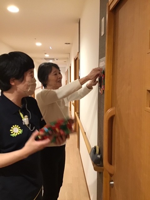 リースは各居室の表札の下に飾らせて頂きました。手の届きにくい場所はスタッフがお手伝いを。