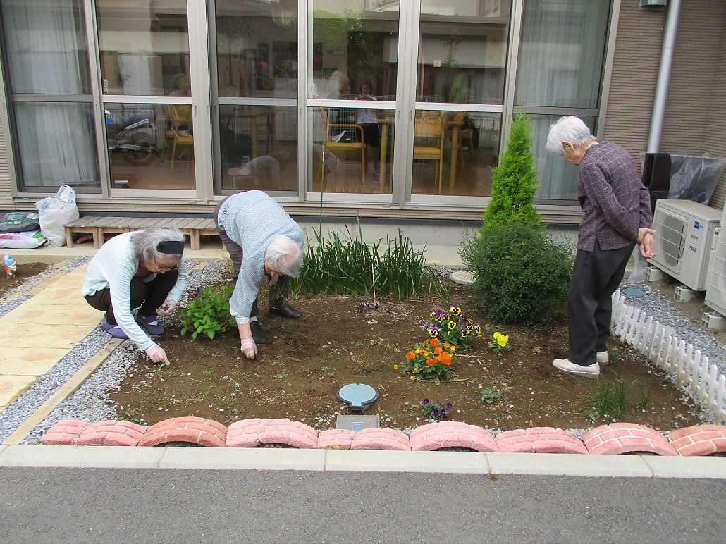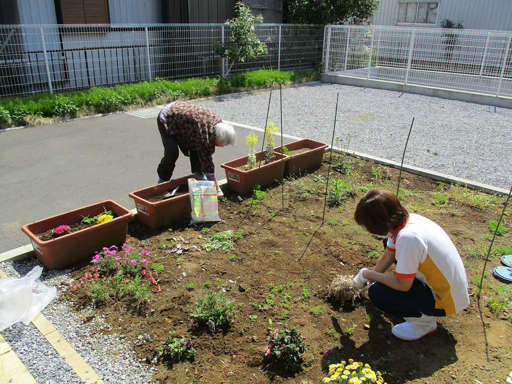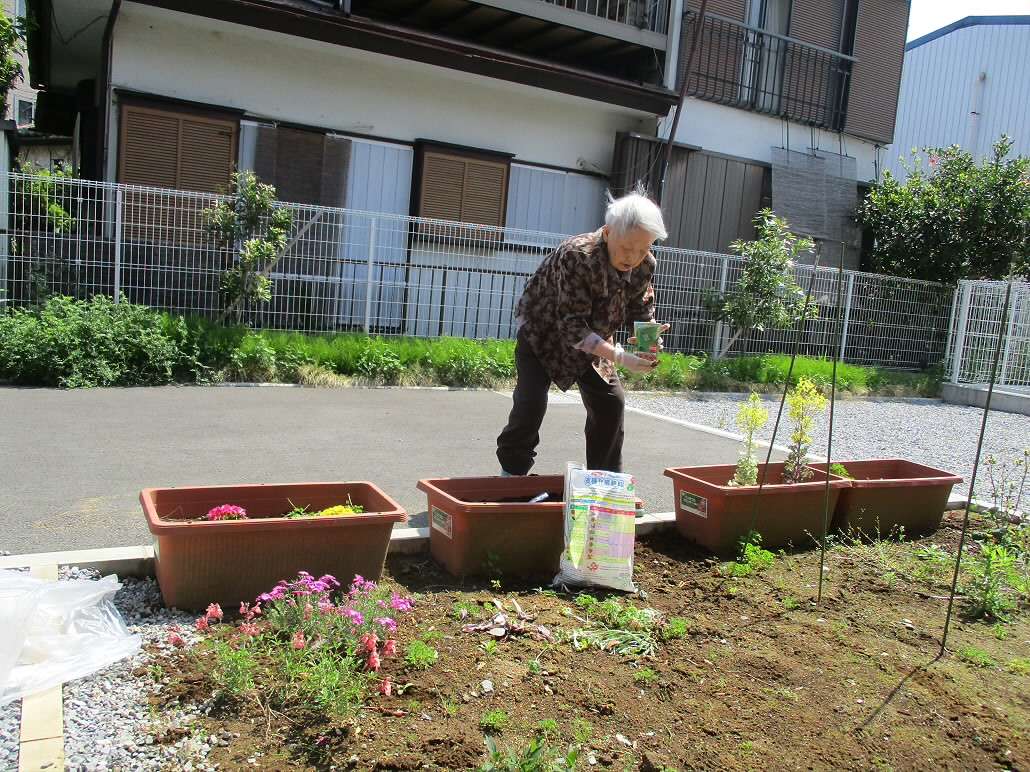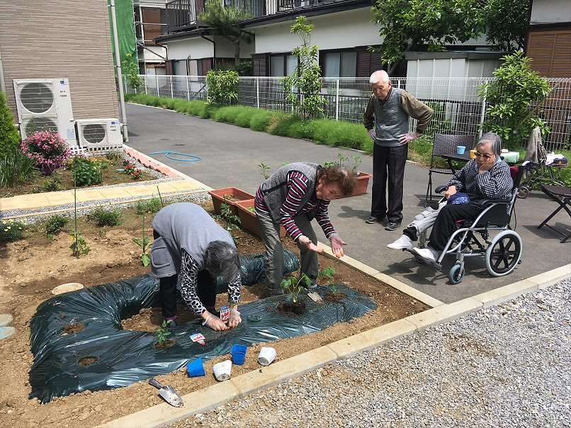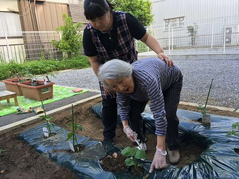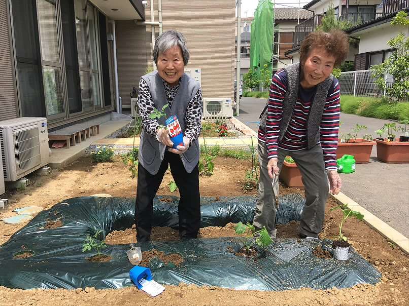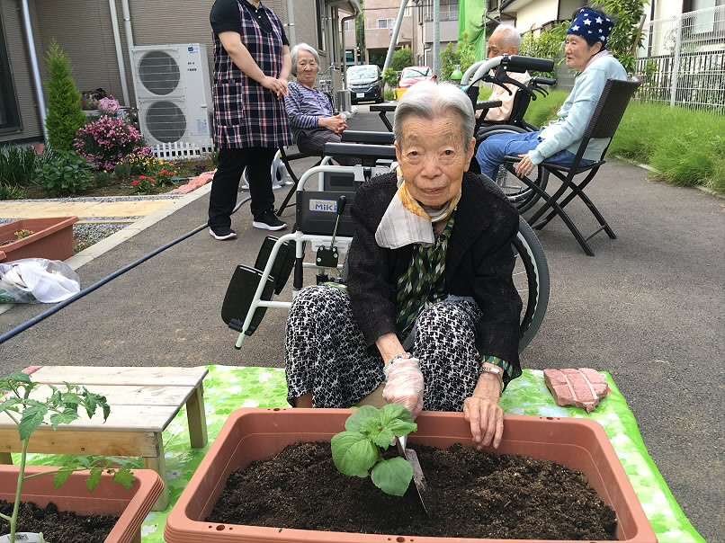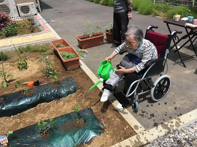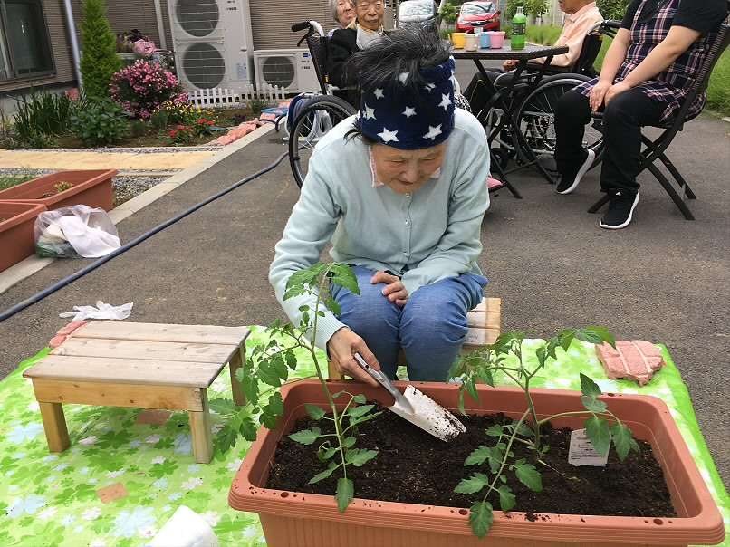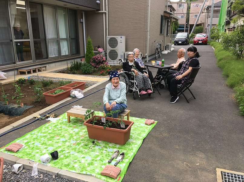 ました。入居者様、スタッフ共々、初夏の暑い陽射しの中、みんなで土まみれになって