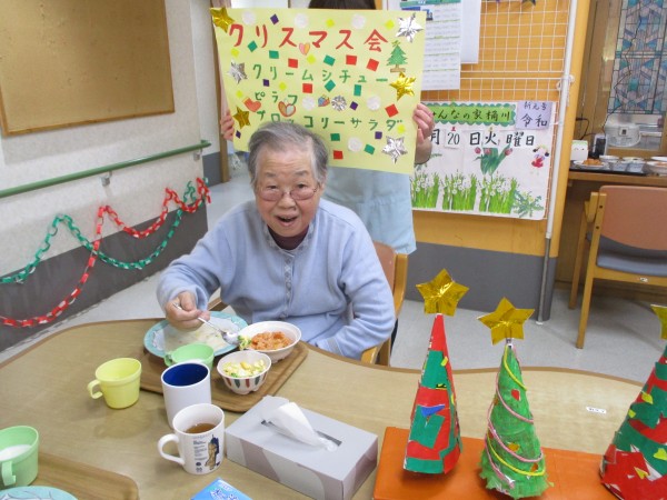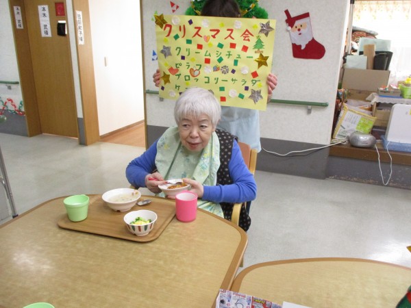 クリスマス会を行い、クリームシチュー・ピラフ・ブロッコリーサラダ・ケーキを食べました!