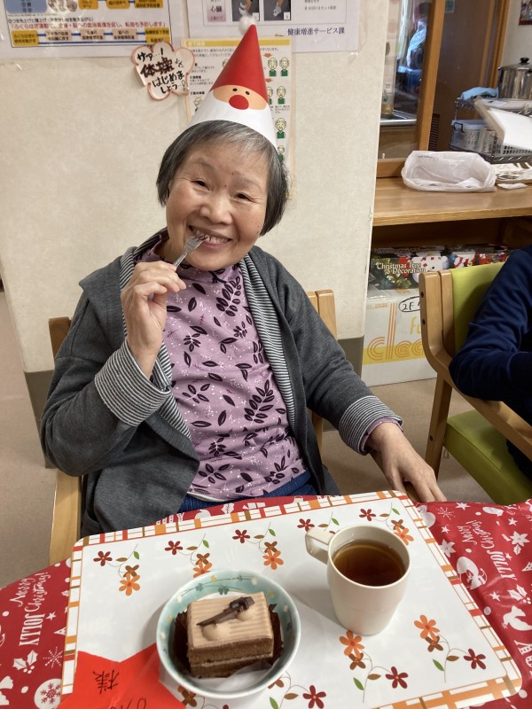 サンタの防止がとっても似合っていますね!美味しいケーキに笑顔がこぼれます。