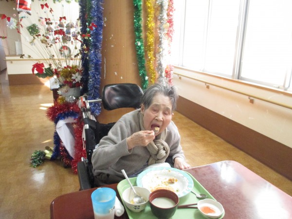 本日は、クリスマスメニューということもあり、普段食事摂取量の少ないご利用者様も、美味しい!と言いながら、召し上がっておりました(^^♪。