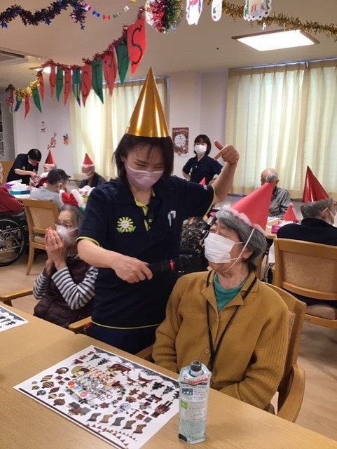 まず、ご利用者様みんなでコスプレ! 定番の赤い帽子やトナカイのカチューシャを!皆さんよくお似合いでした。