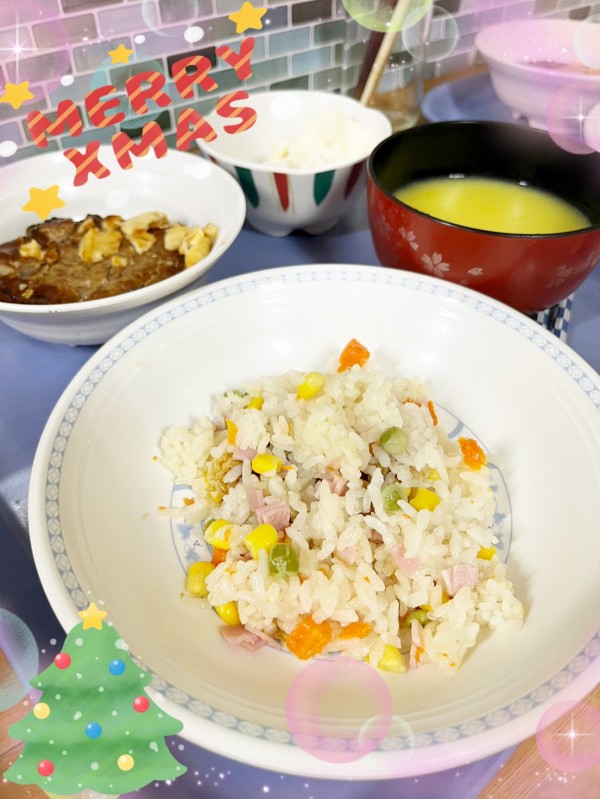 《クリスマスメニュー》✩ピラフ ✩コーンスープ ✩チーズハンバーグ ✩マカロニサラダ