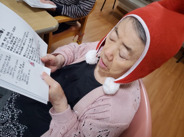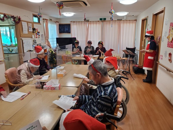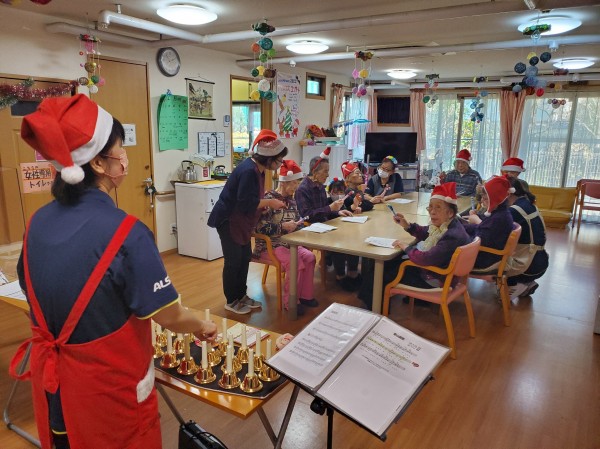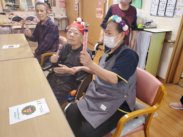 利用者の皆様も各々サンタさんの帽子をかぶられたり、ケアスタッフ手作りの鈴を持ったりされ、準備はOK!